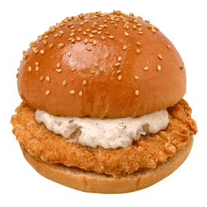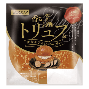 バンズから飛び出す食べ応えのあるチキンフィレ、芳醇なトリュフ入りきのこソースとオニオンダイス